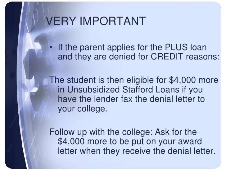 Parent choice upon credit denial of the PLUS Loan: Eligibility for a Parent PLUS Loan is based on a credit check process. Please choose one of the ... Retrieve Full Source